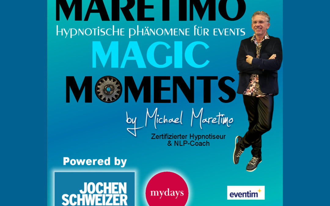 Mein Hypnose-Erlebnisabend MARETIMO MAGIC MOMENTS kooperiert ab sofort mit den führenden Erlebnisplattformen Jochen Schweizer und MyDays. Diese strategische Partnerschaft vergrößert die Reichweite massiv und macht das einzigartige Hypnose-Erlebnis für noch mehr Menschen zugänglich.
